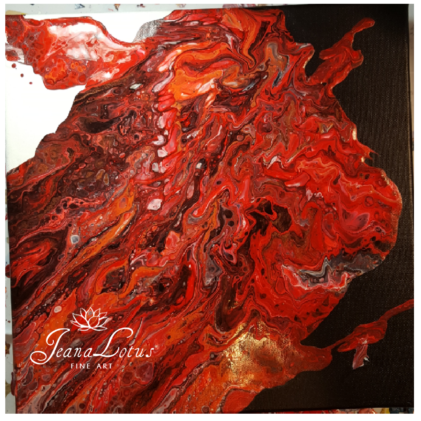 I love this acrylic fluid pour on a 16 x 20 x 1.5" wrapped canvas. In the light, the bold red, black and gold really stand out.