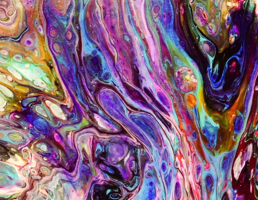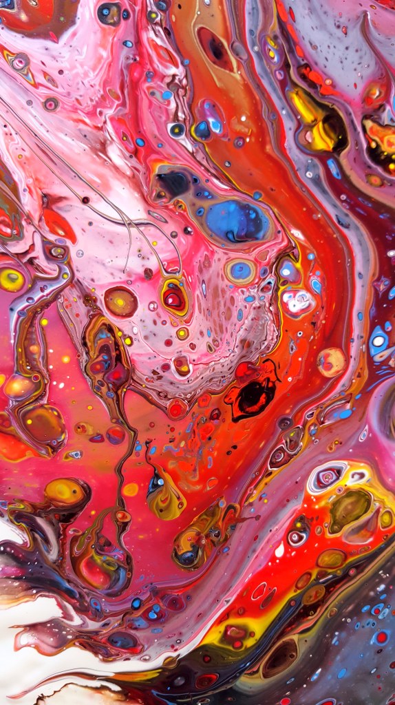 Since I first discovered acrylic fluidart, I have been a maniac! I enjoyed the Zen nature of painting my rock mandalas, but the first time I did an acrylic pour, I was hooked! For the first time I had found a medium as fluid and unpredictable as my digital renderings. I thrive on the bold colors and how they interact with each other. Very satisfying.